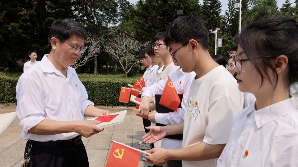 活动第二阶段新党员入党宣誓仪式在渡海英雄烈士墓前进行。伴随着雄壮的《国际歌》,仪式开始。王茂钢代表书院党委宣读新党员名单。随后,全体党员面向鲜红的党旗庄严宣誓,立下为共产主义奋斗终身的庄重誓言。宣誓结束后,关工委的老师为新党员赠授《共产党宣言》和《中国共产党章程》两本重要读物,希望大家读原著、学党章、悟思想,不断提高政治思想和理论水平。