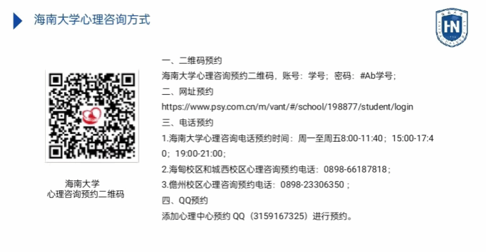建立自己的社会支持系统,如果遇到严重的心理困惑,通过自我调节不起作用,内心感到很痛苦时,那就需要及时寻求帮助。在大学里,有任何烦恼和困惑可以首先联系辅导员老师,他/她会为你提供及时的帮助。同时,还可以预约学校大学生心理健康教育与咨询中心的专业心理咨询老师。这里为大家提供学校的心理咨询渠道: