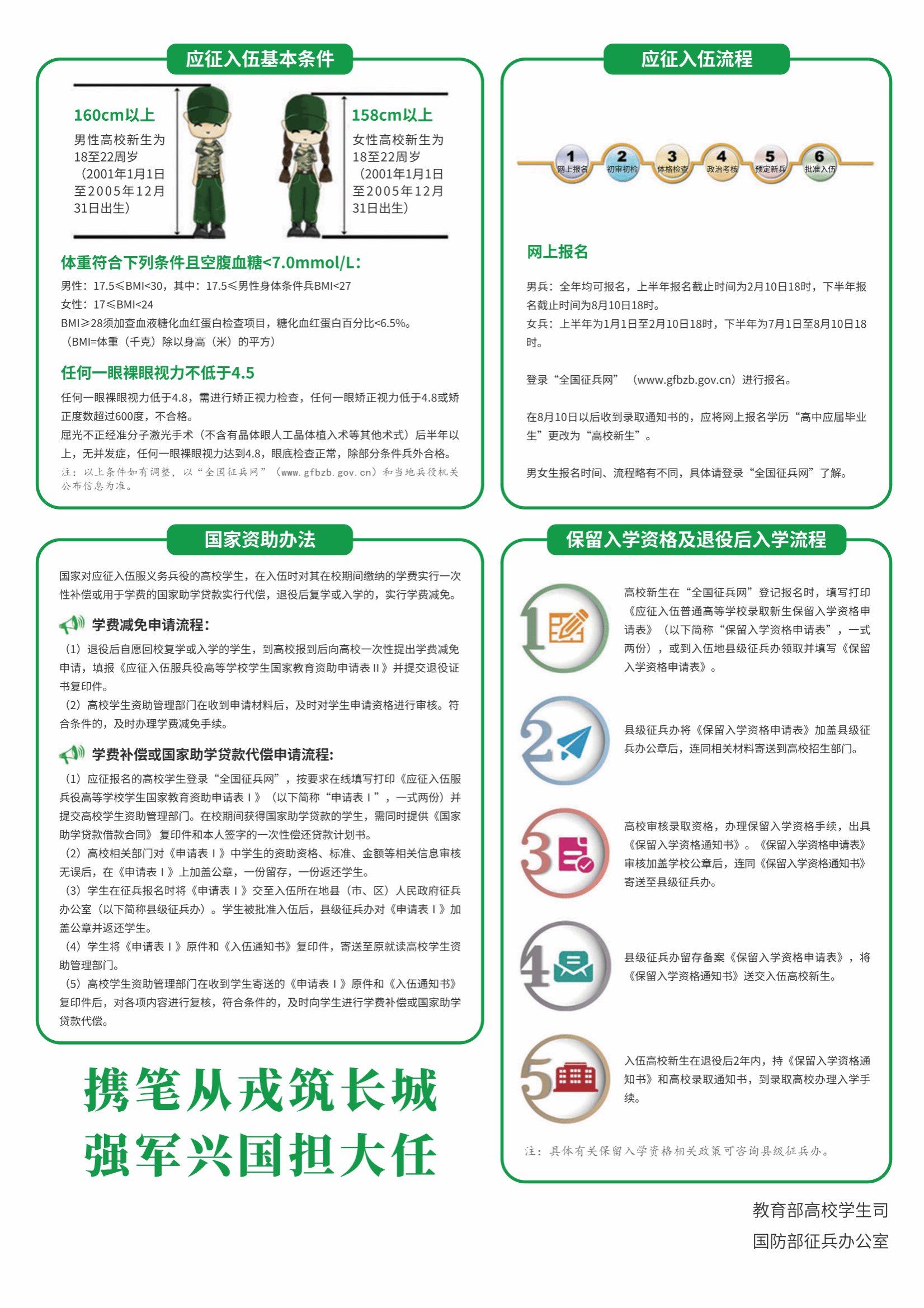 《中华人民共和国宪法》规定: “依照法律服兵役和参加民兵组织是中华人民共和国公民的光荣义务”。部队是青年学生成长成才的大学校,是砥砺品格、增强意志的好课堂,是施展才华、成就事业的 大舞台。国防和军队现代化建设,迫切需要一大批有责任、敢担当的有志青年携笔从戎、报效祖国。为鼓励大学生应征入伍,国家出台了一系列优惠政策,现寄上,供参考。