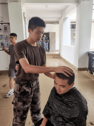 军训是新生大学生活的第一课,理发既是军训的纪律要求,也意味着新生活的从“头”开始。退伍大学生在理发时展现出的军人作风、严谨自律和亲切服务,为新生树立了良好的榜样,也鼓舞了新同学们以积极认真的态度参与军训,增强组织纪律性,以昂扬拼搏的面貌开启新的大学生活。