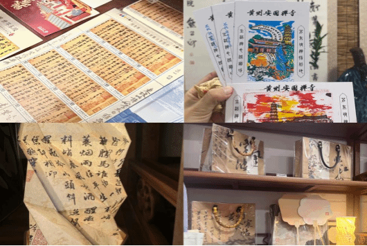 实践团一行首先来到东坡精神的灵魂栖息地——安国禅寺。在工作人员热情接待下,实践团成员有序地游览参观院内东坡文化展览馆,聆听寺院住持崇蒂法师细讲东坡贬谪生平系列故事,详细了解苏东坡在黄州迎来的心性修养上的悟入与文学造诣上的突破。展览馆内陈列众多崇蒂法师自行收集或设计定制的文创产品,件件小而美,令人倾倒折服,除东坡主题邮票与挂件等基础产品外,还有诸多极其出色的首创尝试。如东坡套色印章,解锁“盖章打卡”的文创新玩法,按特定顺序依次叠加,加盖描绘出安国禅寺下东坡吟诵“定风波”的生动场景,在亲手盖章的过程中品味独特的文化气息;东坡主题手工包与扇,包面与扇面选用古风烧边宣纸以手绘国画工艺复刻东坡字画,使“寒食帖”“临江仙”等东坡诗画元素融入日常的生活场景中,亲手触摸到东坡走过的历史温度;又如充满创意的手作诗集旋转纸灯,书灯内页印有精选东坡诗词,使人于阅读氛围中跨越古今,暗含文创开发者的匠心演绎与实际考量。临走前,崇蒂法师赠与实践团成员东坡的诗书典籍与香囊,让他们带着东坡文化的深厚赠礼再出发。这些别具新意的文创产品与文雅古朴的东坡精神携手,传承东坡文化的同时融入现代理念,为东坡文化创造性转化、创新性发展及现代化诠释提供新的思路。