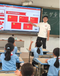 科普课上,团队成员带领小朋友们认识了我国重要的12面旗帜,同时讲授了海洋、人工智能、应急救护等方面的知识,小朋友们通过课程不仅认识了我国重要的旗帜及其所代表的精神和信仰,也学习了解到相关的科学知识。