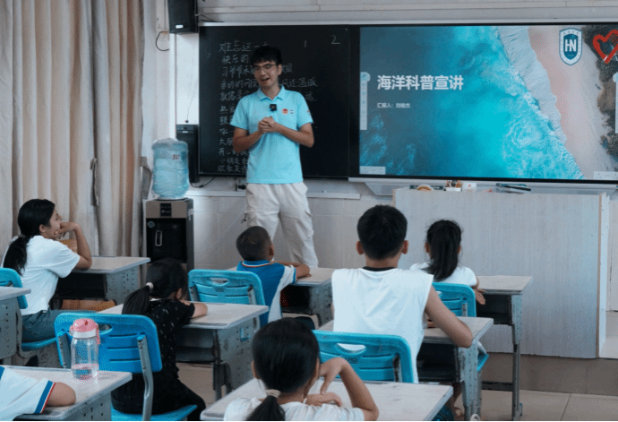紧接着,实践团深入到学校各班级,围绕“老兵故事”“中华优秀传统文化”“海洋知识”“人工智能”“趣味数学”等主题开展科普讲解。课程结束后,还带领小朋友们排练了歌曲《习爷爷是我们的大朋友》并在国旗下一起合唱,深受孩子们喜欢。大家纷纷表示跟海南大学的哥哥姐姐们度过的这几天非常开心。