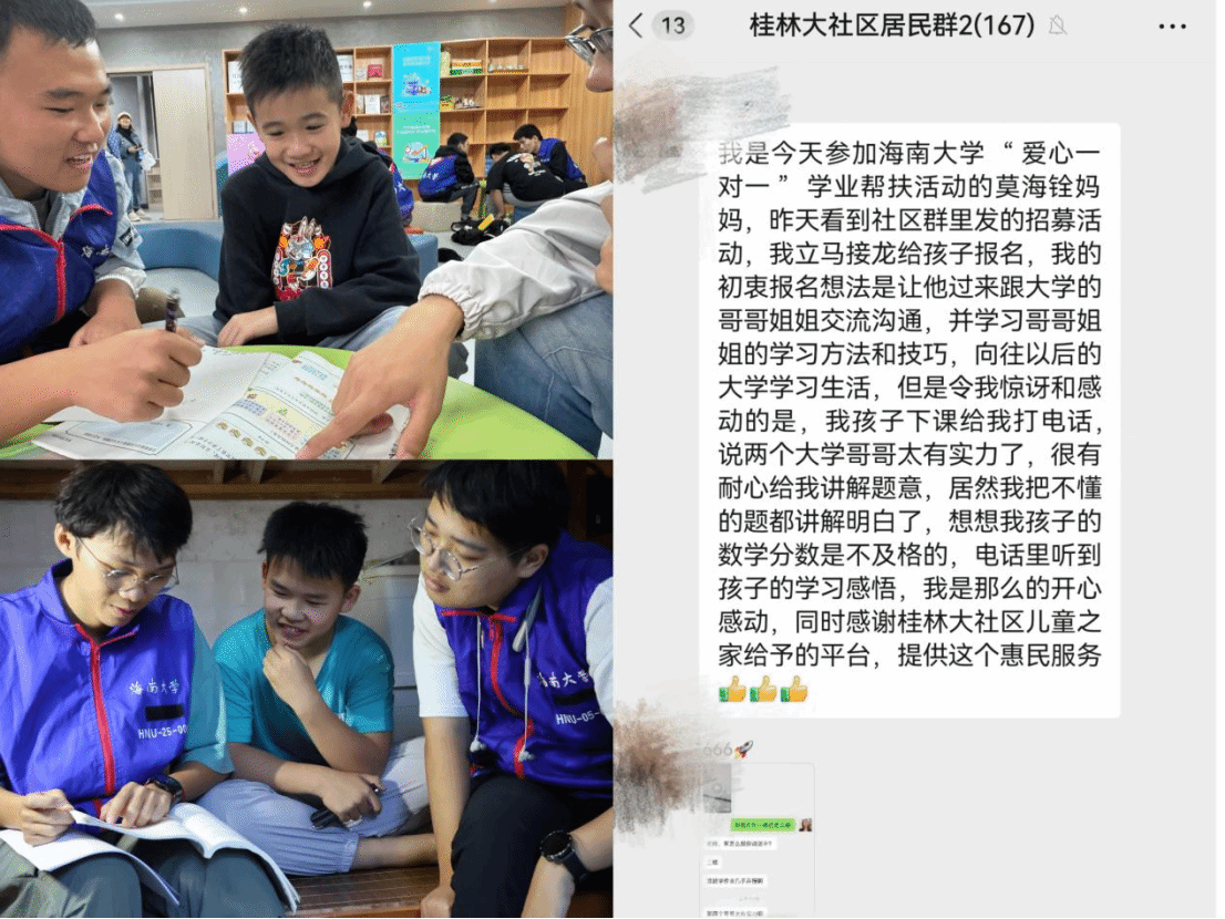 为深入推进团中央“大学生社区实践计划”,引导青年学生走进基层、服务基层、服务人民群众、增强时代责任、提高社会化能力,努力在实践中成长成才,11月25日-12月2日,海南大学永利集团88304官网团委组织团支部积极走进海口市琼山区桂林大社区和三门坡镇,与需要学业帮扶的家庭结对开展课后服务,实现一个团支部对接一户学业困难学生家庭的“一对一”结对帮扶。