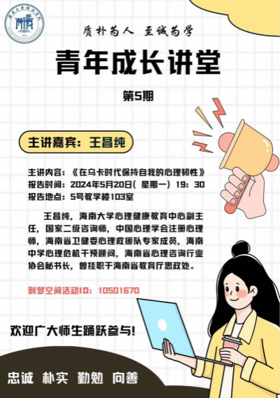 海南大学永利集团88304官网将于5月20日(星期一)在5号教学楼103室举办青年成长讲堂(第5期),欢迎大家积极参与。