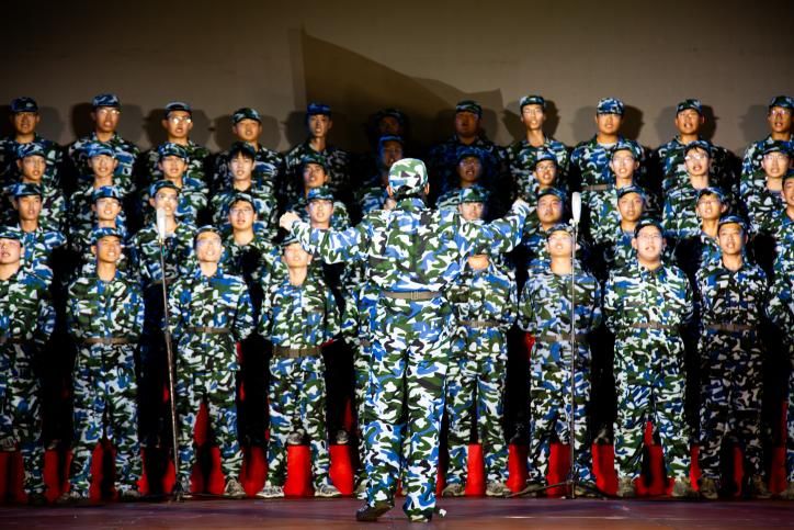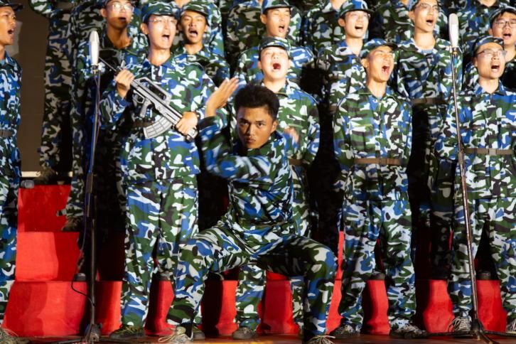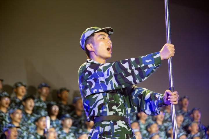永利集团88304官网代表队身着整齐的迷彩服,迈着坚定的步伐走向合唱台,“朴诚!朴诚!”的口号声响彻校园。