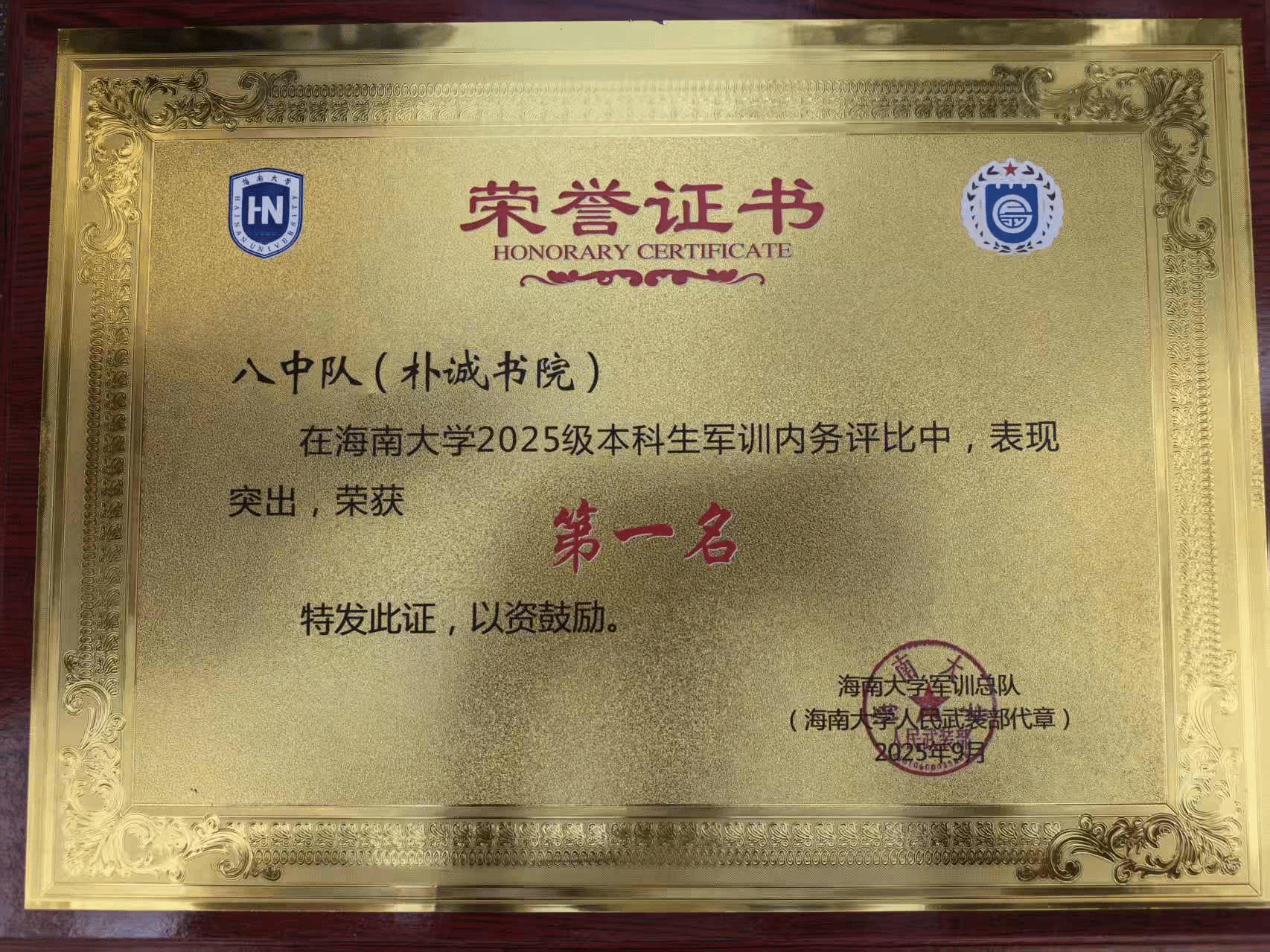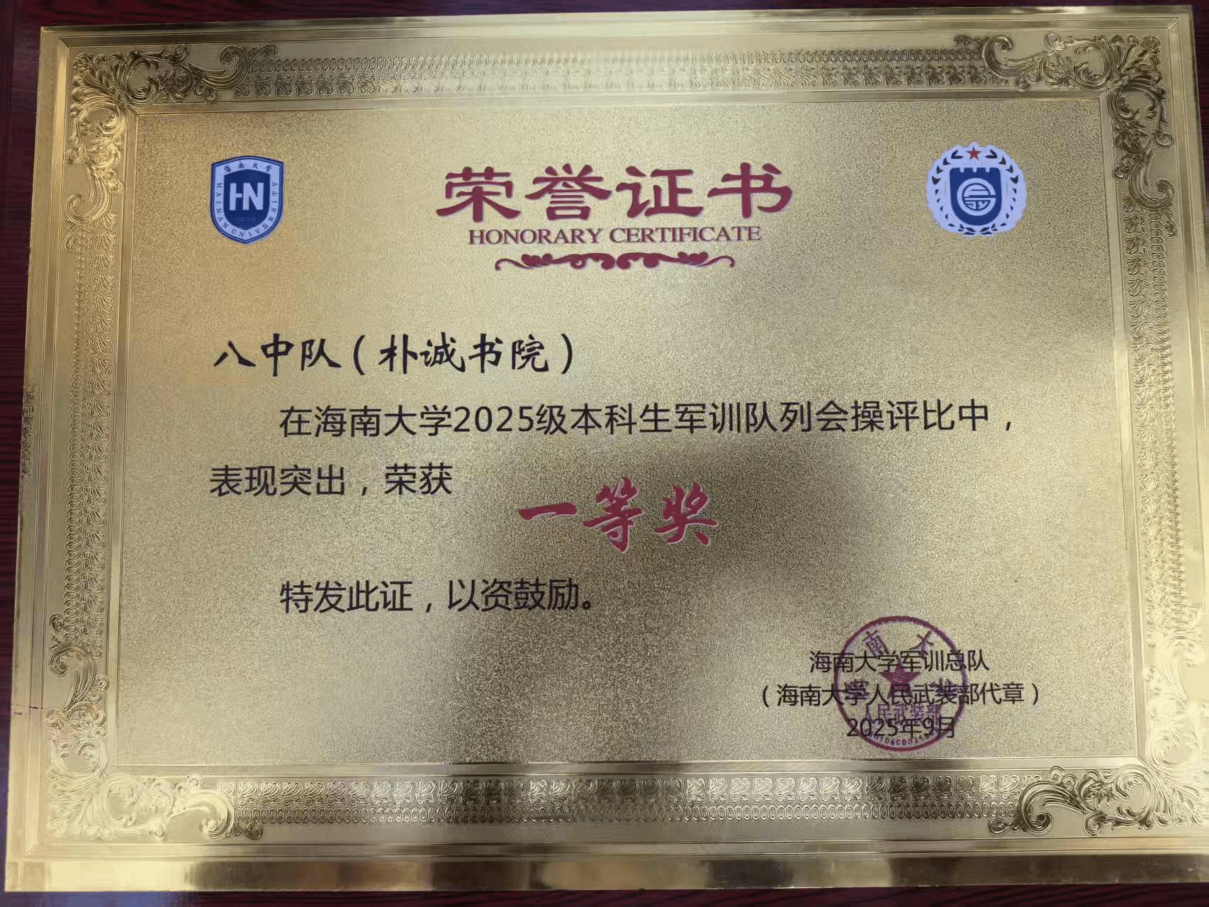 2025年9月18日下午,为期14天的新生军训落下帷幕,在参训教官、辅导员和2025级新生的共同努力下,第八中队(永利集团88304官网)分别荣获队列会操第一名、内务评比第一名、歌咏比赛第四名的优异成绩,伍庆清、许煌宇获评优秀带训教师,向舒怀等10名同学获评军训标兵,卓昊天等93名同学获评军训先进个人。