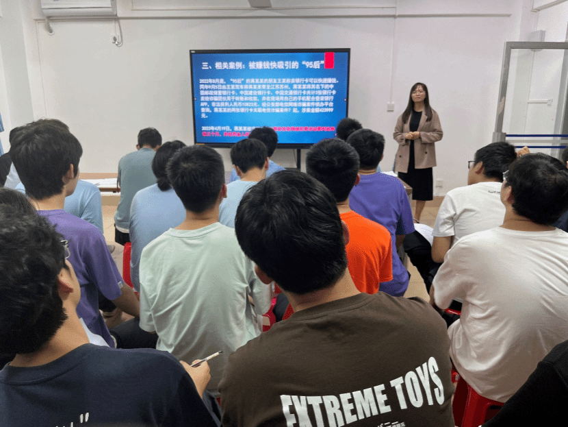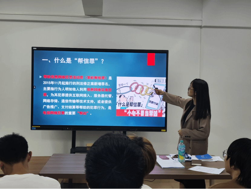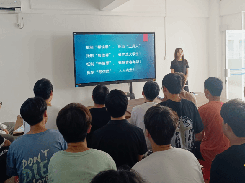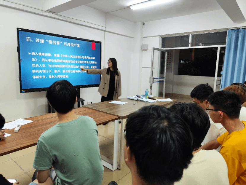 会上,宋海婷老师为同学们介绍什么是“帮信罪”,“帮信罪”常见的主要方式,相关案例及涉案值得关注的人员,涉嫌“帮信罪”的严重后果及如何增强反诈防骗能力。在开展的过程中,宋海婷老师通过提问、案例探讨等方式与同学们进行互动,强化学生对班会学习内容的吸收。在总结时,宋海婷老师希望同学们要自觉抵制“帮信罪”,拒绝为诈骗分子当“工具人”,主动学法知法懂法守法,珍惜青春美好年华,将专业知识融入社会发展,将个人理想与国家发展相结合,做对社会有担当、有贡献、有价值的大学生。
