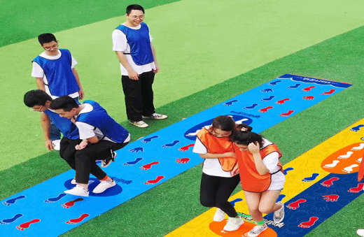 比赛前由队内协商分组,抽签决定各组出场次序。采取两两对抗的方式,用对应的身体部位去接触喷绘布上的图形并通过全图完成游戏,身体其他部位不能接触图形以外的区域,否则视为犯规。第一组结束将绑脚传递给下一组,下一组继续接力,直到三组全部完成。用时短者获胜。(注意:每队有3分钟准备时间,每队6人)