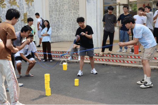 ①每队由两组接力完成(每组5人);②每位队员在不能说话的条件下运用已有的积木,建造一座高塔,要求使用所有积木块。堆叠后屹立不倒3秒,本组计时结束;③第一组成员完成高塔堆叠后,根据工作人员指示第二组成员进行接力堆叠后屹立不倒3秒,本队计时结束。