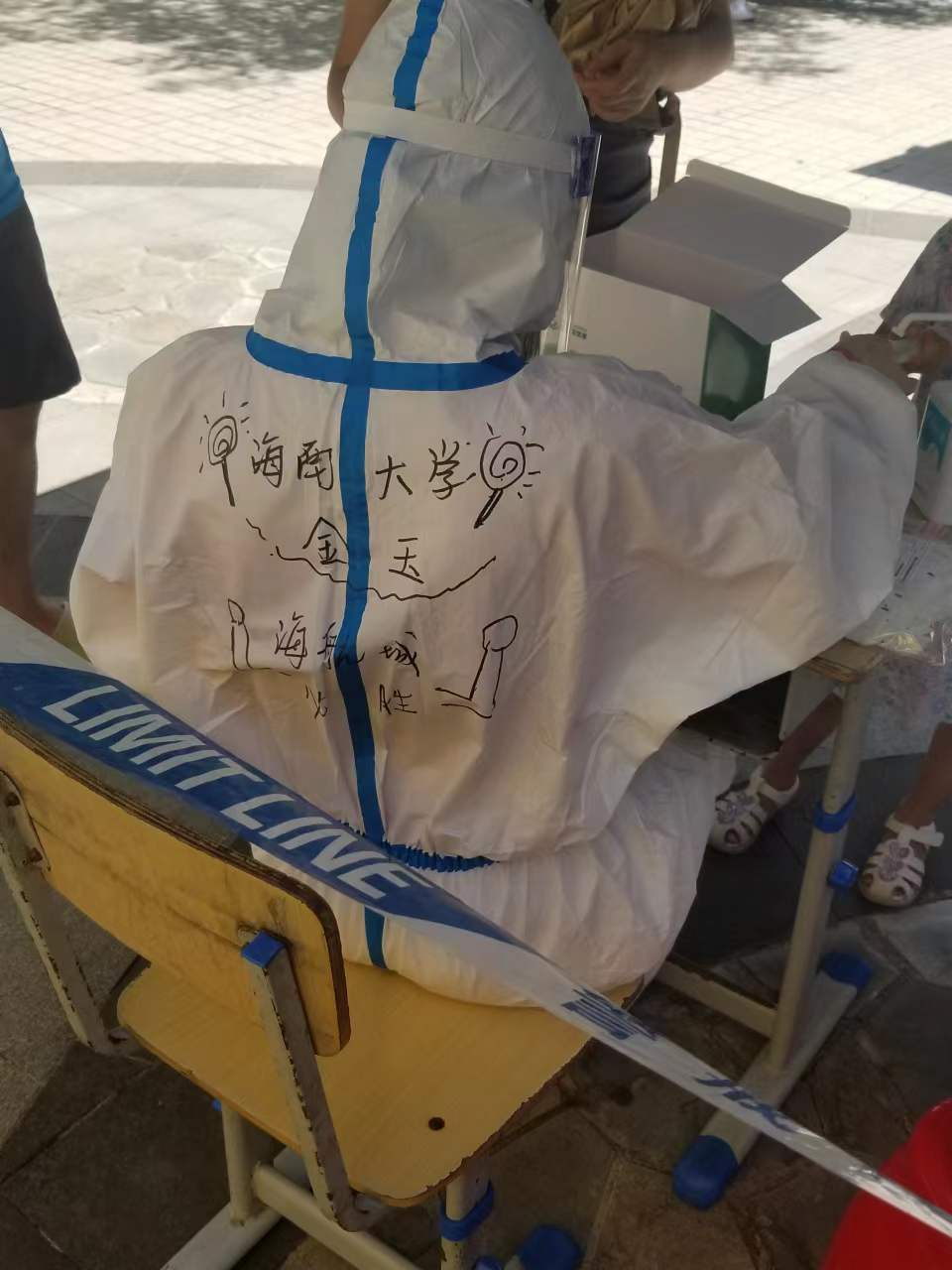 小岛的八月,往往都是最充实、最热情的时候,但因突如其来的疫情,打乱了生活节奏,也让整个小岛按下了暂停键。身为一名共青团员,我深知自己的使命与职责,于是我积极响应共青团的号召,报名加入抗疫志愿者队伍。我主要的工作负责采样信息录入,发放咽拭子采样用品等。工作期间,我会穿戴好防护装备,并检查其规范性,及时换岗,在保证安全的前提下完成信息录入工作。在这10天的时间里,我完成了近4000人的信息录入量。很荣幸我也成为了“大白”中的一员。在海南炎热的季节,防护服一穿就是10天,我亲身体会到了医护人员的辛苦和不易。我也有幸为来自上海的援琼医疗队画防护服。在那里,我还结识了众多青年团员、大学生等志同道合的志愿者,大家都坚守在自己的岗位,为疫情防控贡献自己的力量。