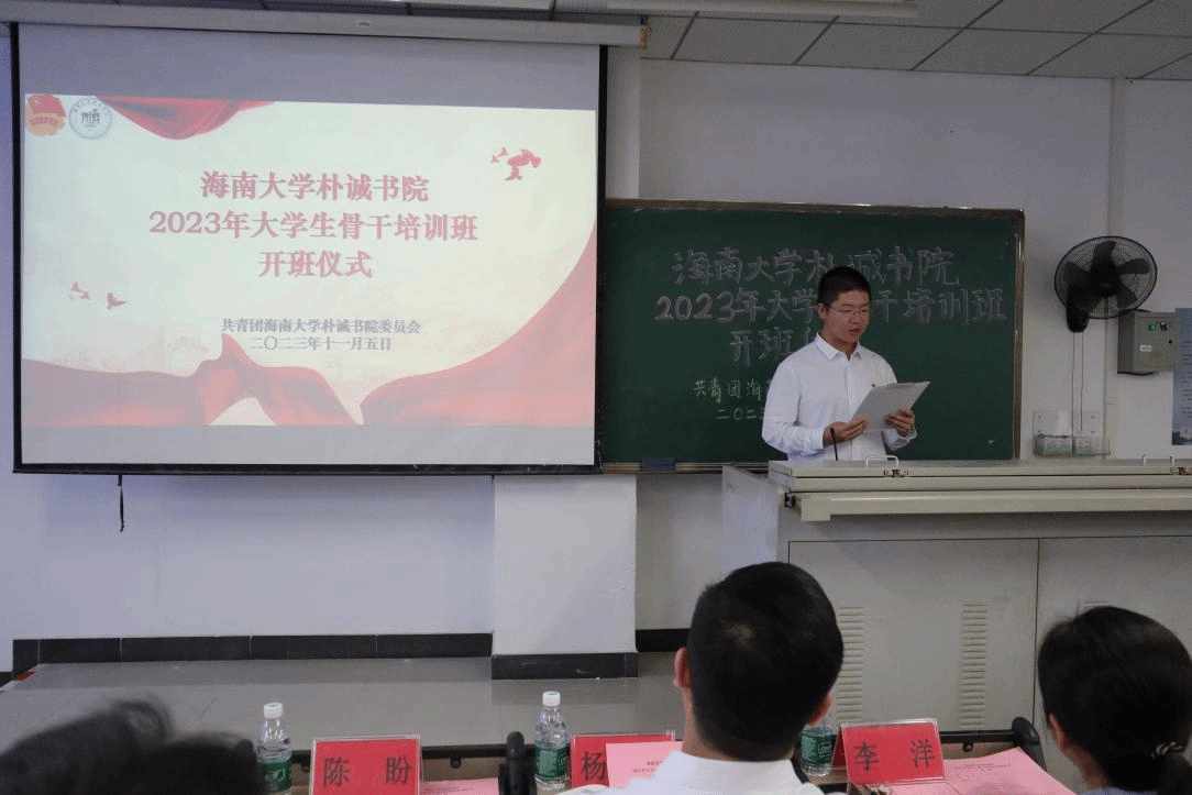 11月5日上午,海南大学永利集团88304官网2023年大学生骨干培训班开班仪式及首场专题讲座在5-301教室举行。校团委副书记杨智伟、书院党委书记李洋出席仪式,书院各学生组织骨干和团支书参加。书院团委书记陈盼主持活动。