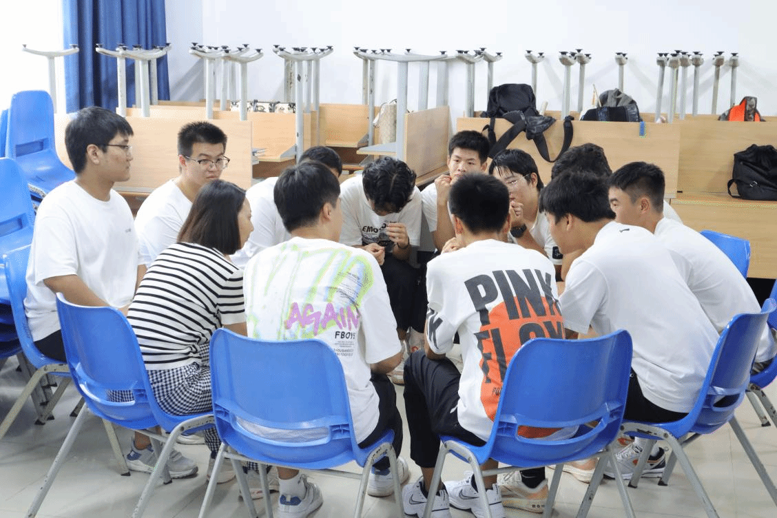在经过激烈的讨论后,主讲老师要求每组成员们围成一个圈,相互坐在相邻同学的腿上,确保不会有人摔倒,然后齐声喊出自己的组名和口号。这对组员们相互配合的默契度和彼此之间的协调性提出了很高要求。各组纷纷开始练习并讨论战术,最终都顺利完成了挑战,整个活动现场笑声不断,氛围十分活跃。
