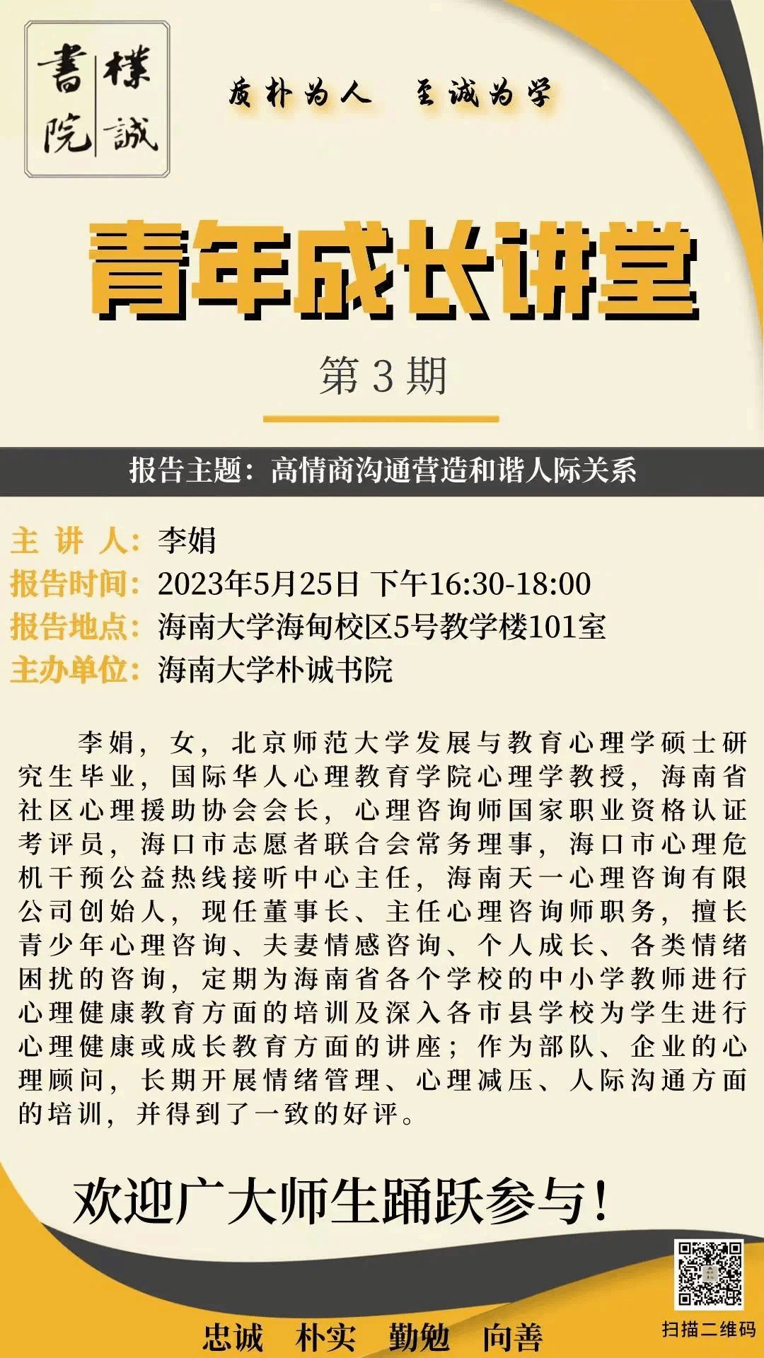 海南大学永利集团88304官网将于5月25日在5号教学楼101室举办第三期“青年成长讲堂”,欢迎大家积极参与。